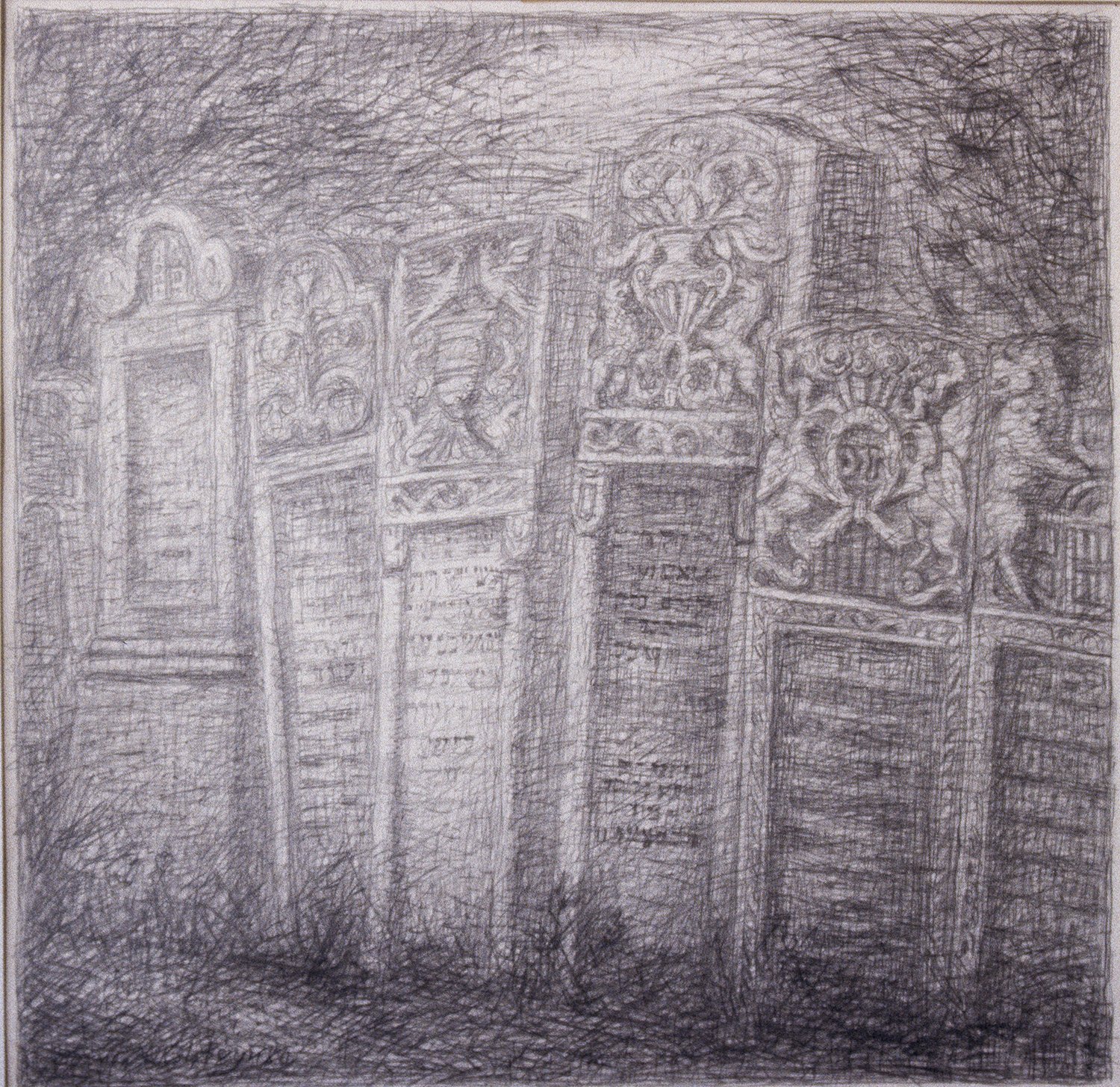 "Don't Forget There Are Relatives" drawings are of the old Jewish cemetery in Chernivtsi. The cemetery has been long closed and is weed-choked. The drawings accurately portray toppled and tilting gravestones with Jewish religious symbols and offer haunting testimony to how much the memory of this once vital Jewish community has been relegated to an almost abandoned past.